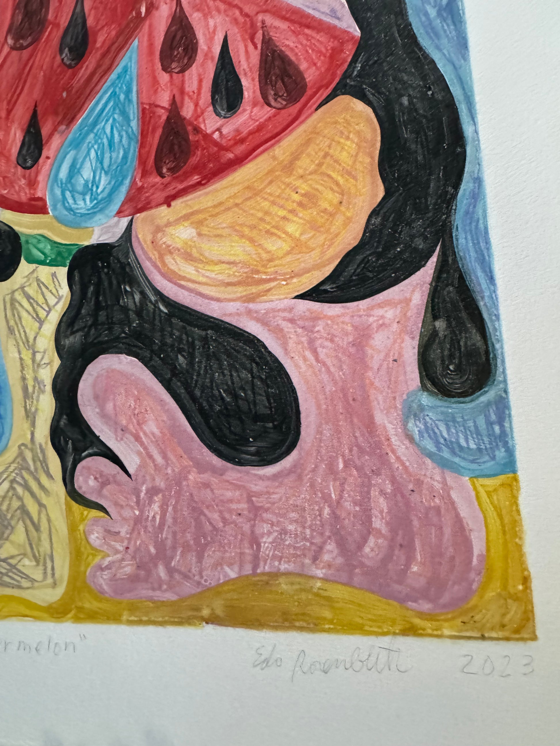 Pictured is the wonderful "Watermelon" monotype by Edo Rosenblith. This work is a 1/1 work on Rives BFK paper and measures 15" x 19".