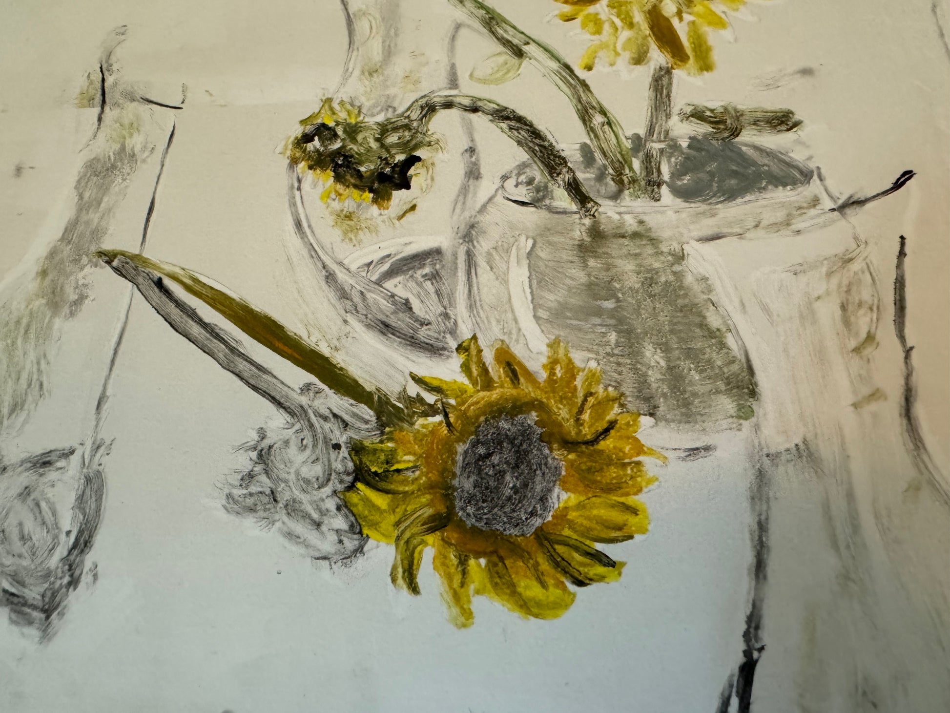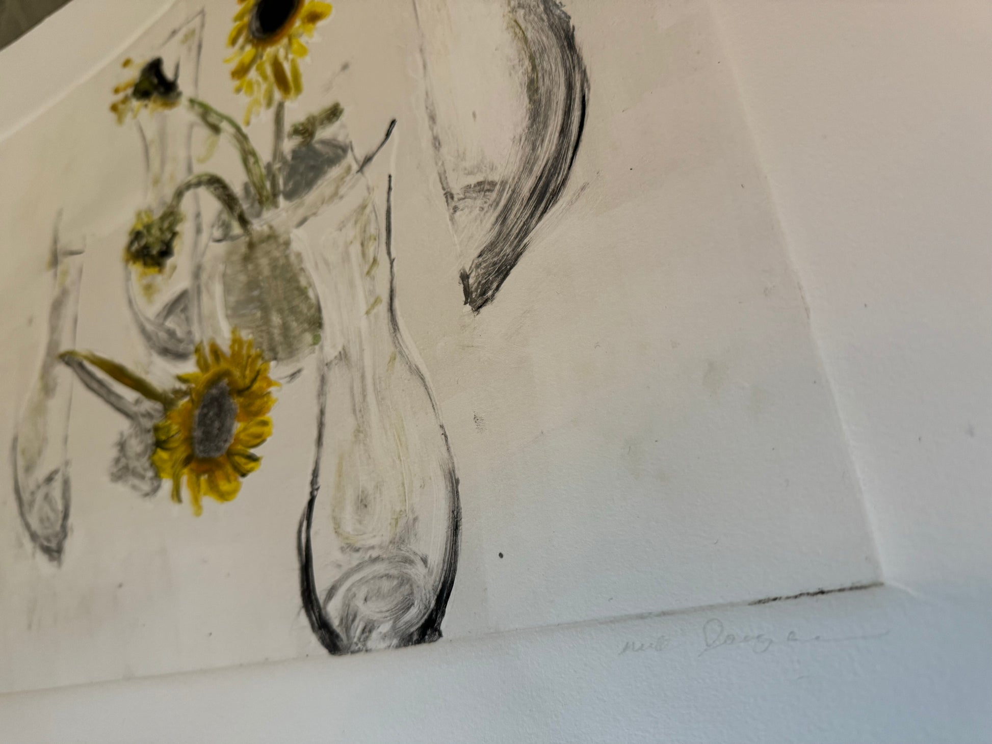 This work, entitled “Split Vase Still Life”, was created during Nick’s recent residency in Chatham NY. During his time, Nick focused on exploring still life and plein air techniques using different mediums and this work is a perfect example of his exploration. The monotype measures 15” x 22”