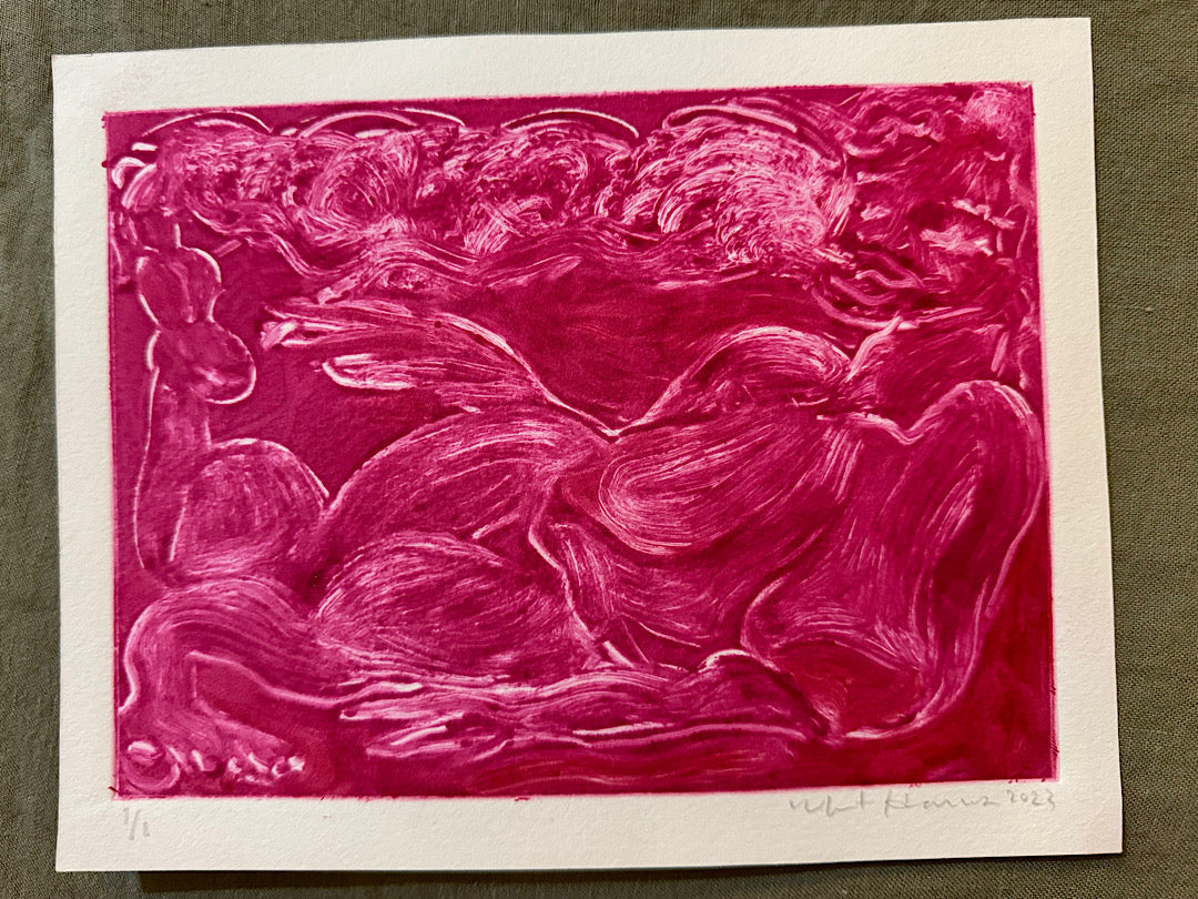 Pictured is a beautiful 1/1 monotype by Whit Harris. The work was printed during Whit's residency in Chatham, NY at The Macedonia Institute. The work measures 7.5” x 11.5” and is printed on Rives BFK printing paper.