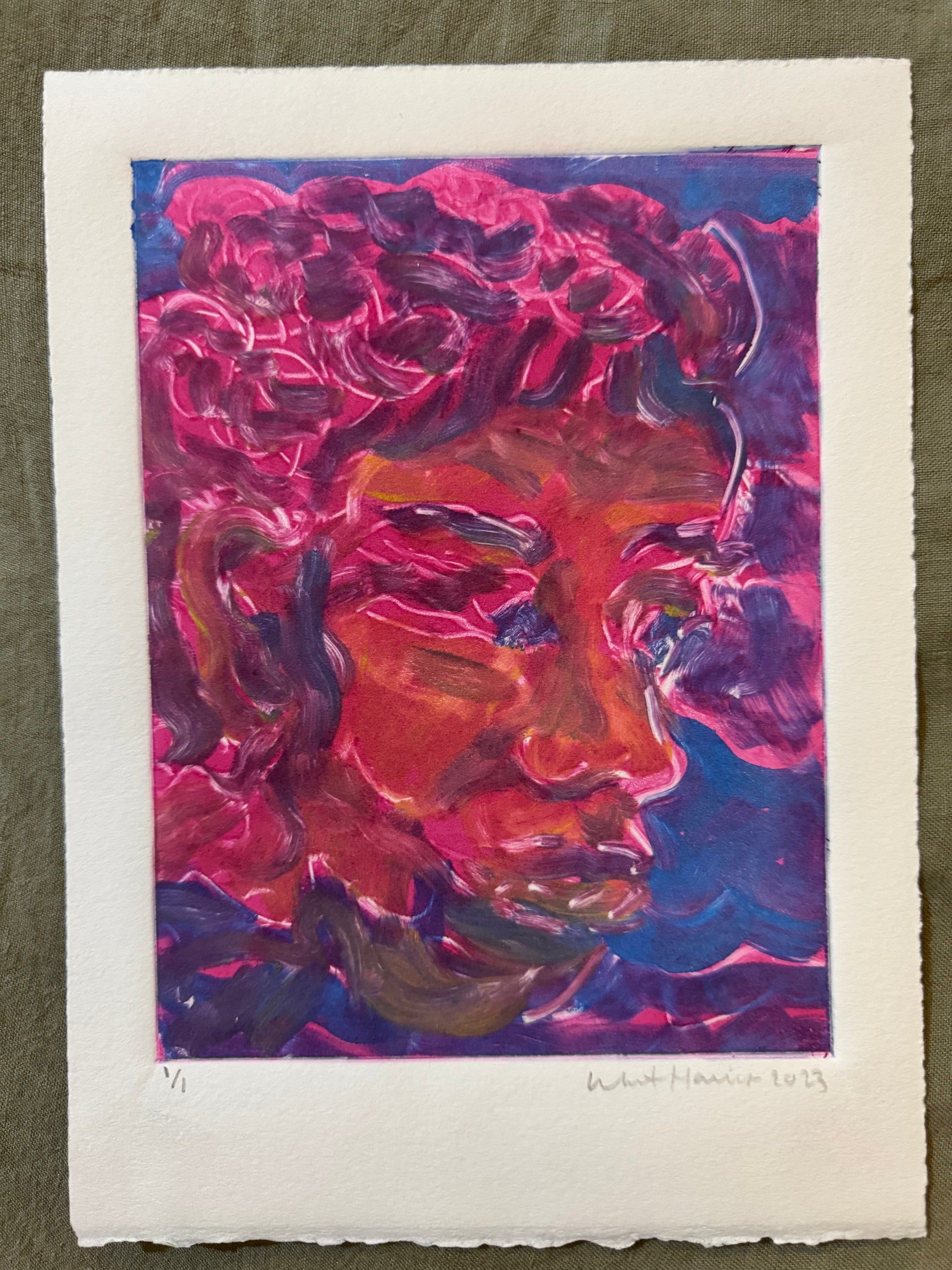 Pictured is a beautiful 1/1 monotype by Whit Harris. The work was printed during Whit's residency in Chatham, NY at The Macedonia Institute. The work measures 7.5” x 11.5” and is printed on Rives BFK printing paper.